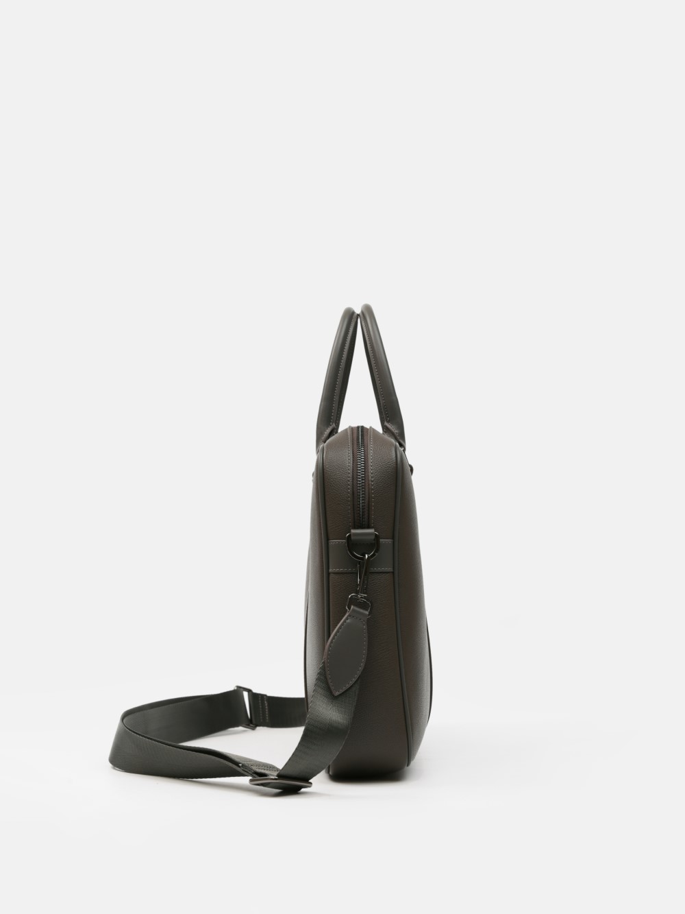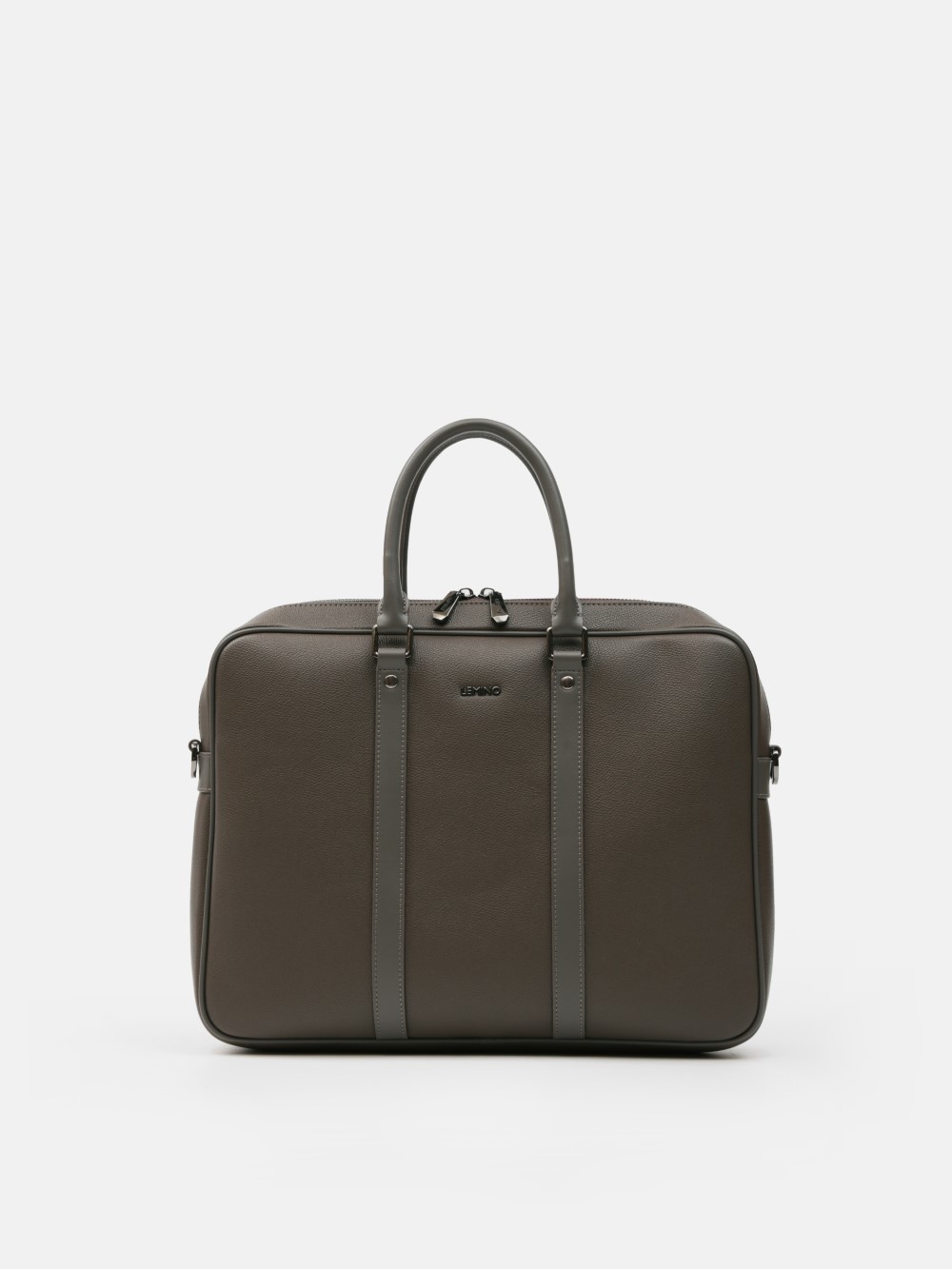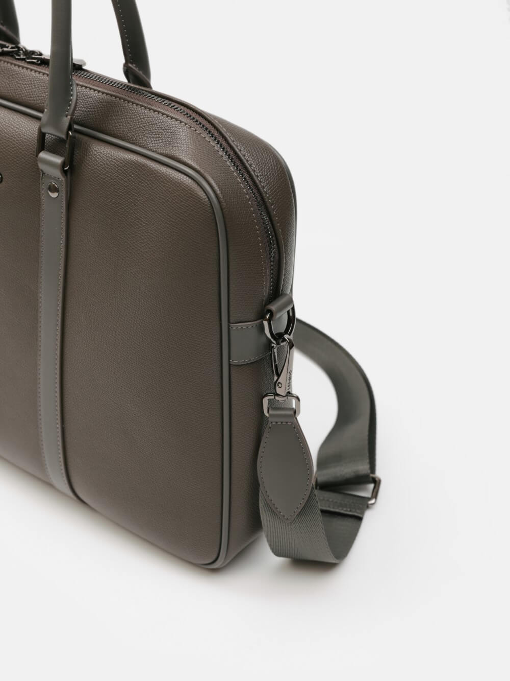 Cặp nam phom hộp tối giản, bề mặt da hạt chống xước nhẹ, điểm nhấn hai dải dọc và khoá kéo đôi kim loại trầm. Ngăn chính chứa tài liệu A4, laptop mỏng 13–14", bố trí thêm ngăn phụ cho điện thoại – bút – cáp. Đi kèm dây đeo bản rộng tháo rời và quai xách đôi, giữ phom đứng đẹp khi sử dụng. Dễ phối từ suit công sở đến smart-casual cuối tuần, giúp anh giữ vẻ gọn gàng và chuyên nghiệp suốt ngày dài.