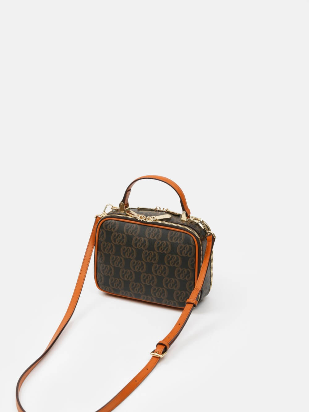 Túi box monogram LEMINO 2 ngăn – dáng vuông bo góc giữ phom, khóa kéo chạy quanh, tay xách da thanh lịch. Logo lớn nổi bật, viền da cam nâu sang nét, phù hợp đi chơi – hẹn hò – tiệc nhẹ.
