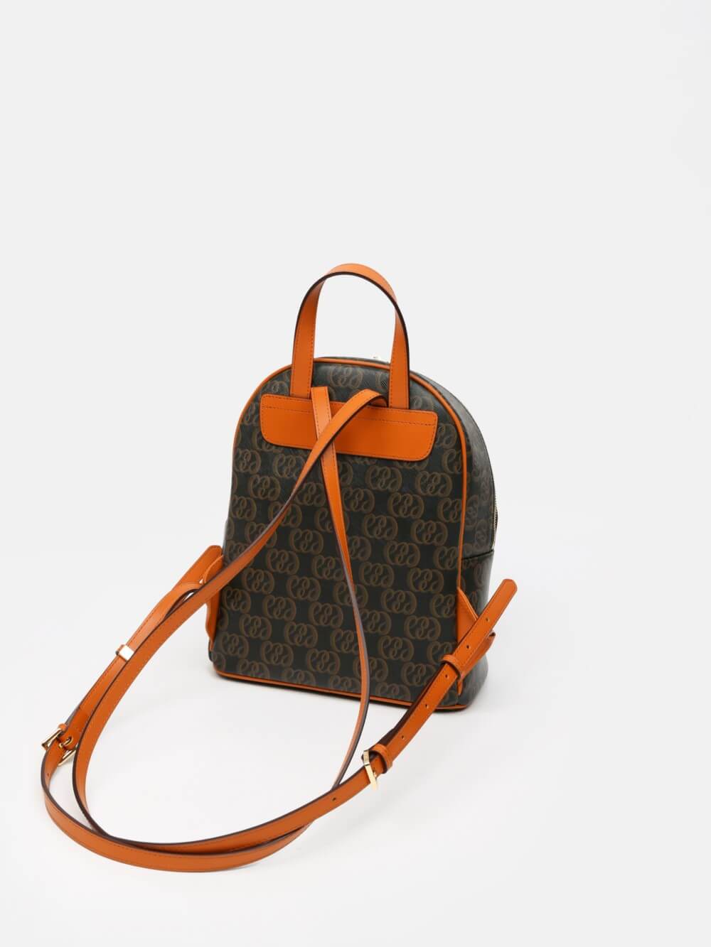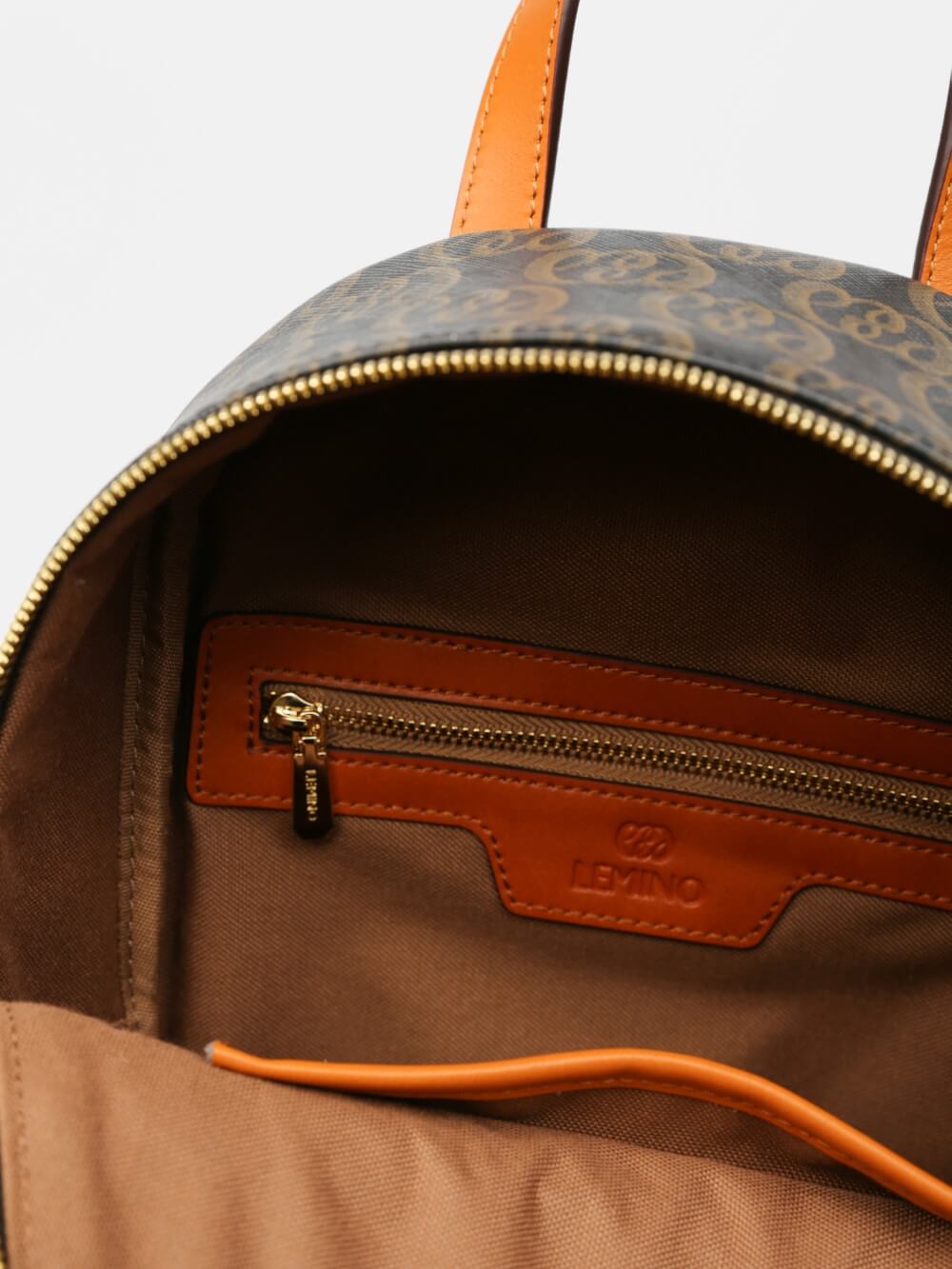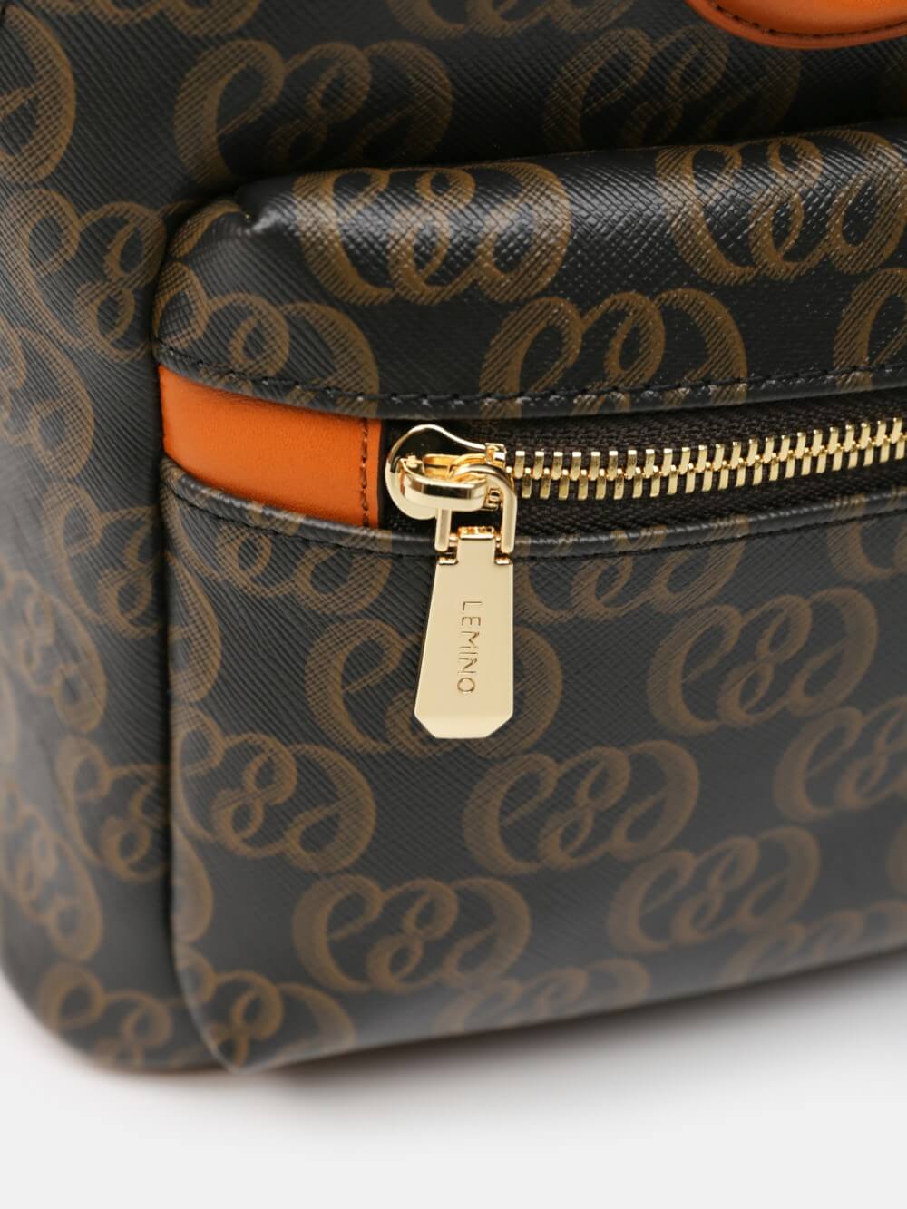 Balo mini monogram LEMINO – dáng cong gọn nhẹ, logo nổi tinh tế, phối da cam nâu sang nét. Thiết kế ngăn chính khóa kéo đôi và ngăn phụ phía trước tiện sắp xếp, phù hợp đi làm – dạo phố – du lịch.