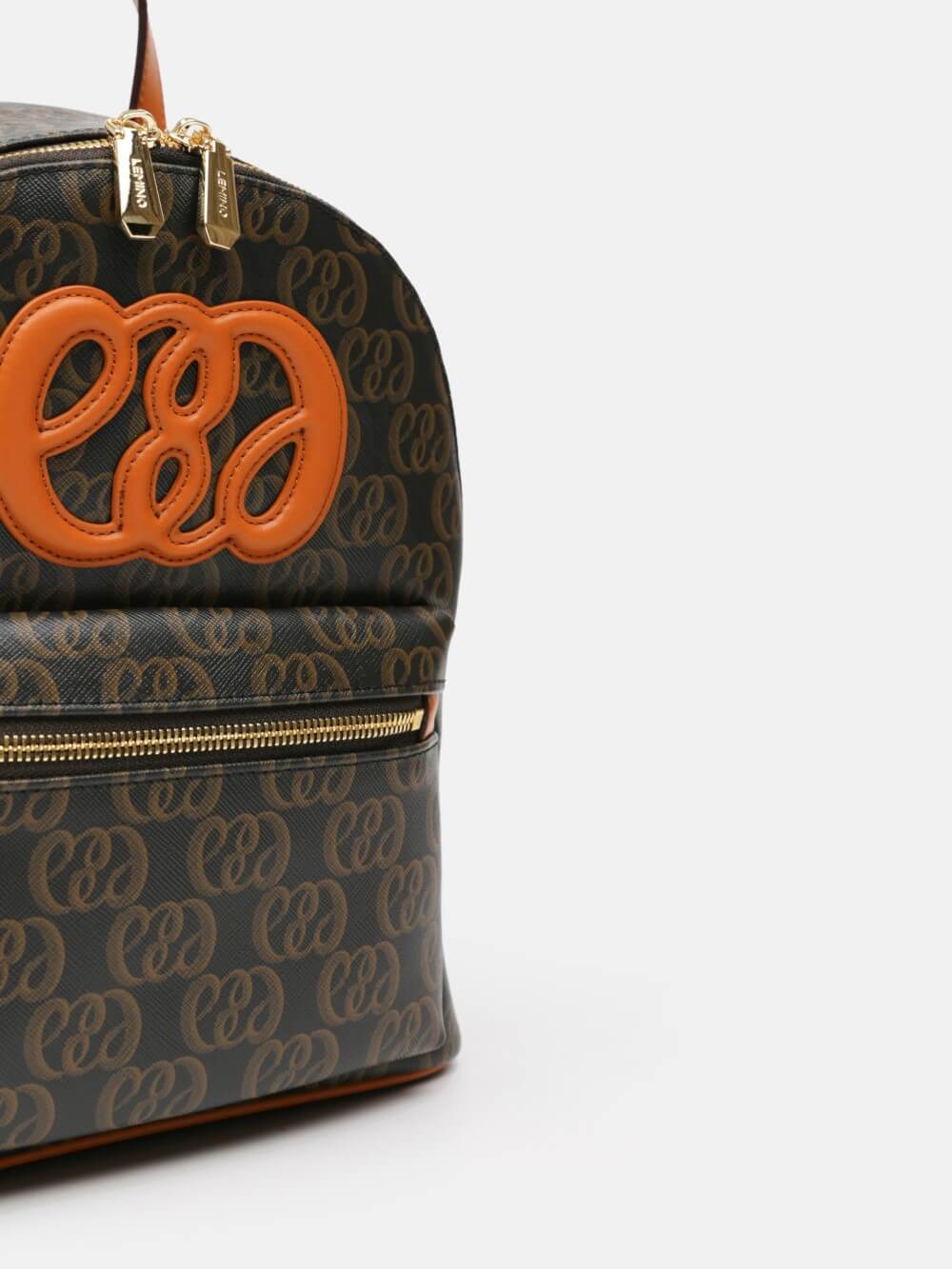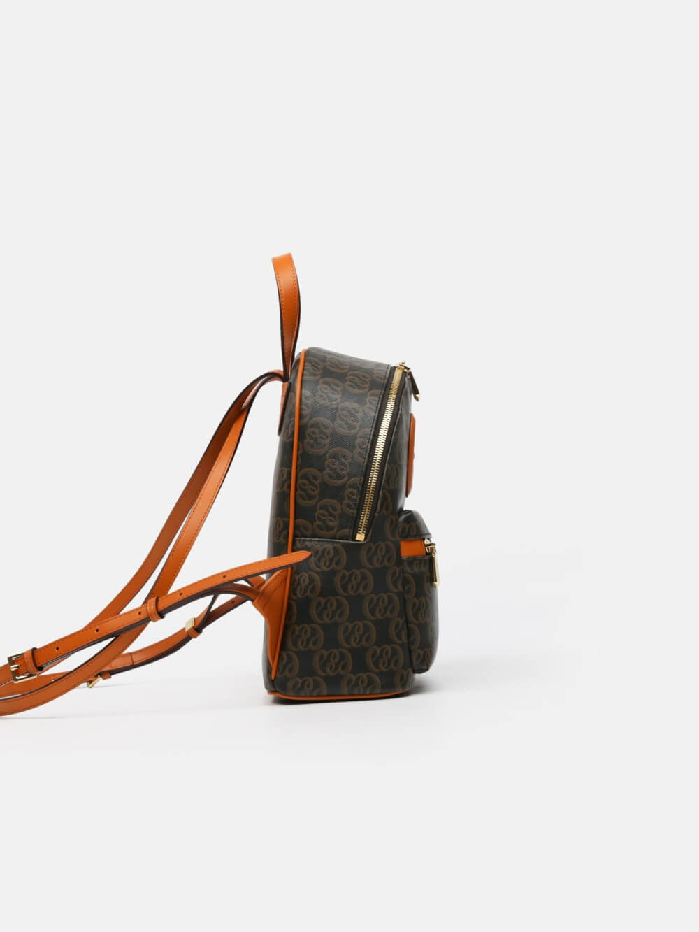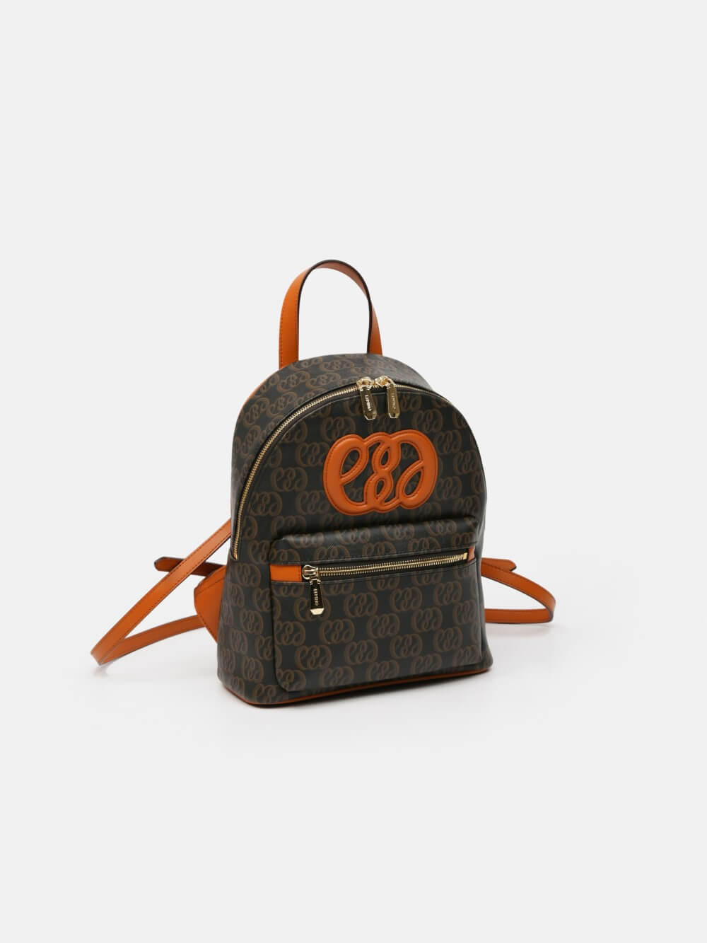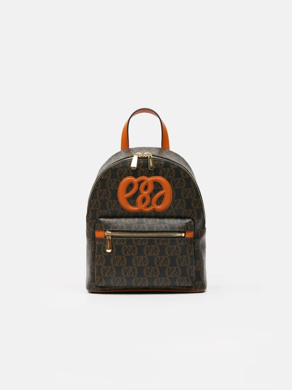 Balo mini monogram LEMINO – dáng cong gọn nhẹ, logo nổi tinh tế, phối da cam nâu sang nét. Thiết kế ngăn chính khóa kéo đôi và ngăn phụ phía trước tiện sắp xếp, phù hợp đi làm – dạo phố – du lịch.