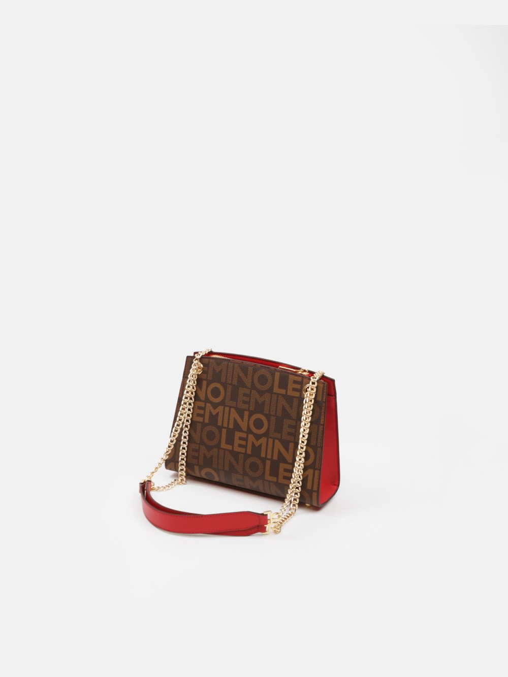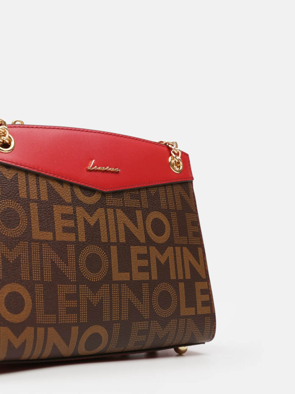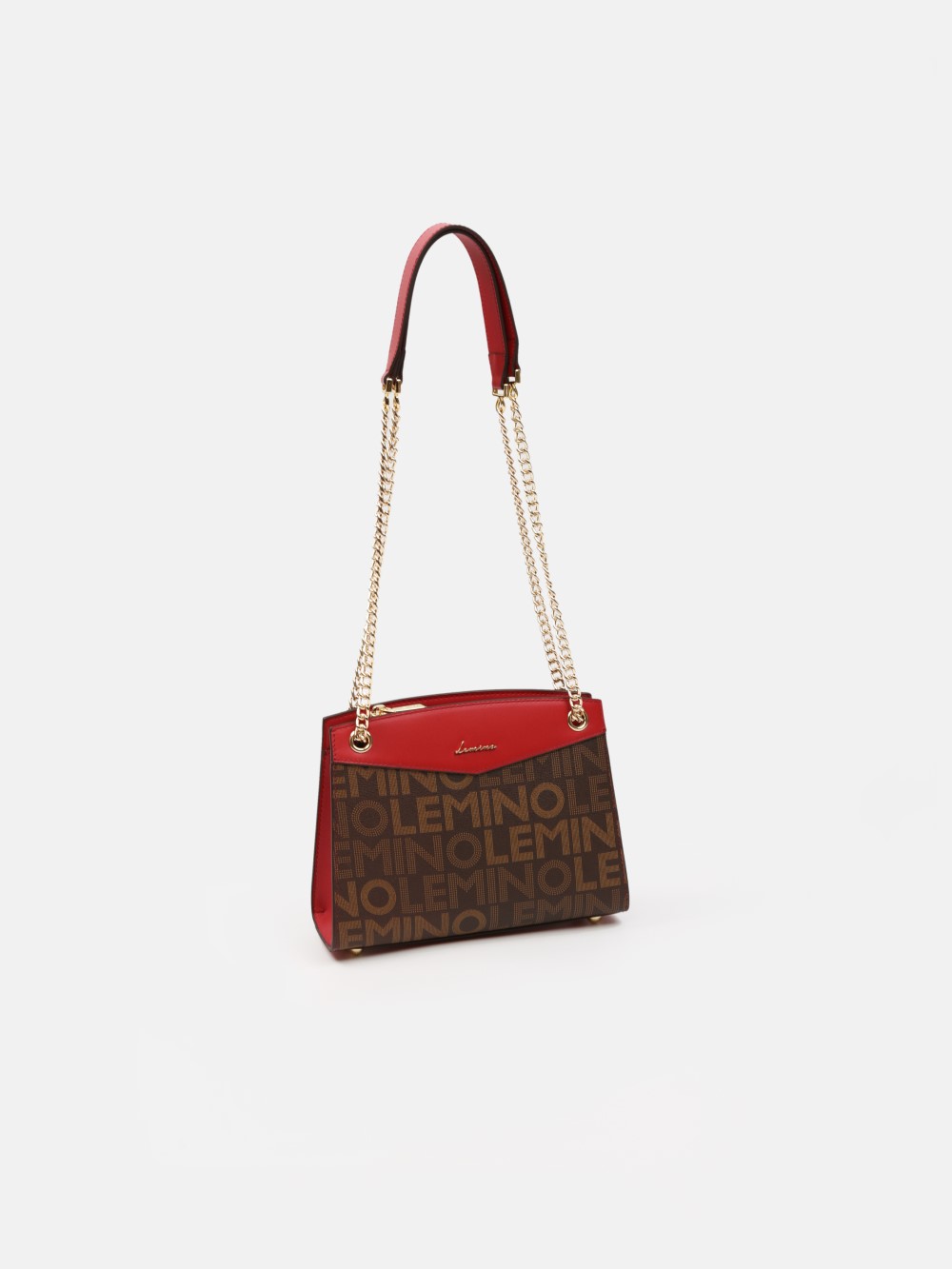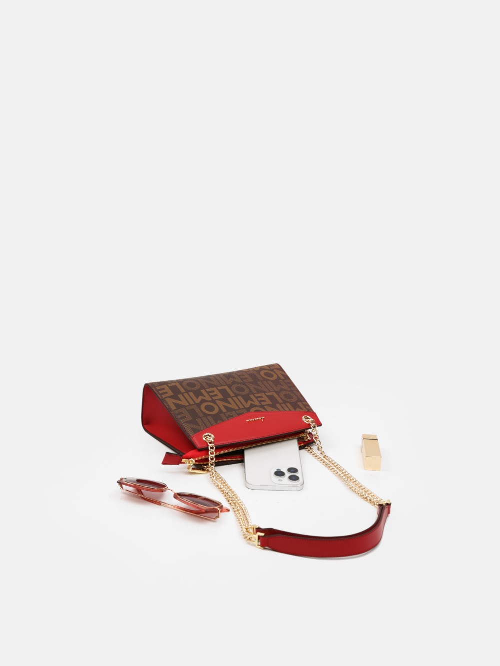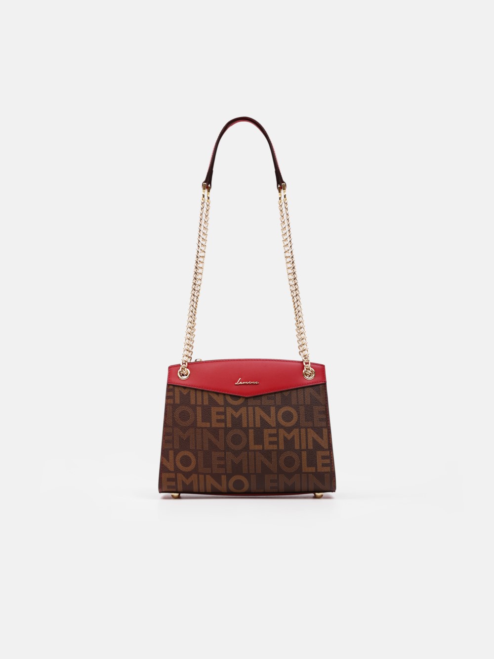 Túi LEMINO Monogram dáng trapeze đứng phom sang gọn, phối nắp màu nổi bật và dây xích ánh vàng kèm đệm da êm vai. Dễ phối đi làm – đi chơi