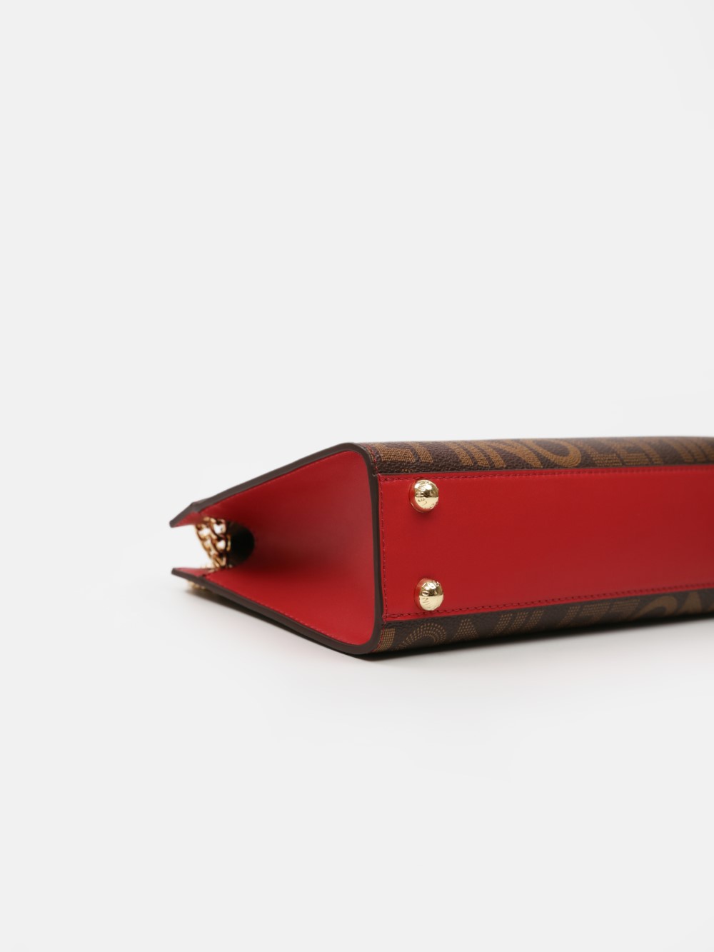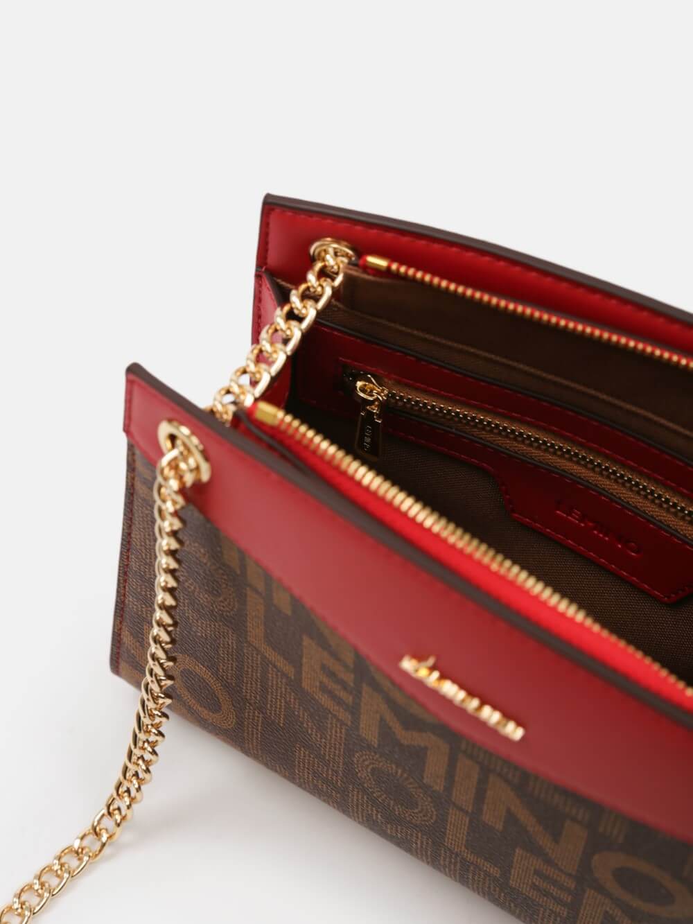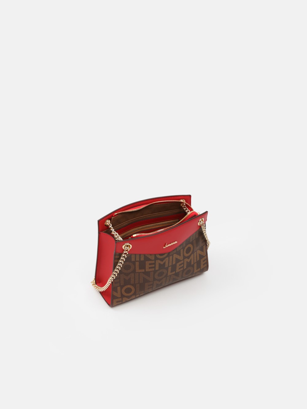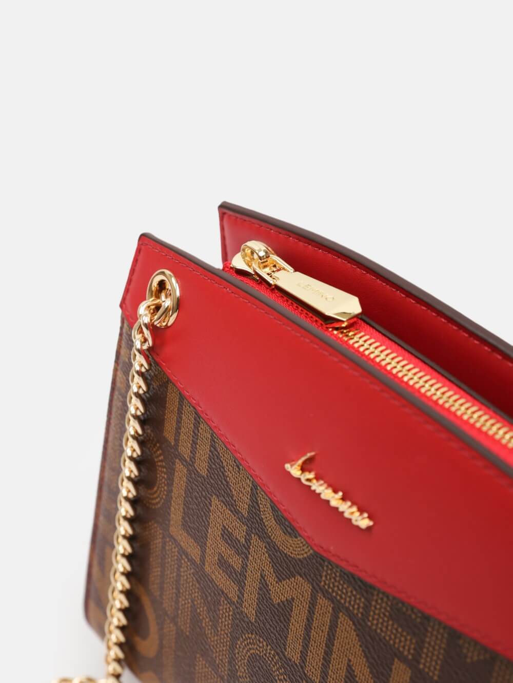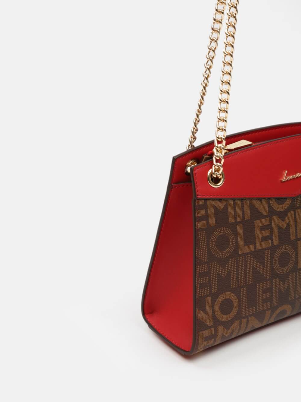 Túi LEMINO Monogram dáng trapeze đứng phom sang gọn, phối nắp màu nổi bật và dây xích ánh vàng kèm đệm da êm vai. Dễ phối đi làm – đi chơi