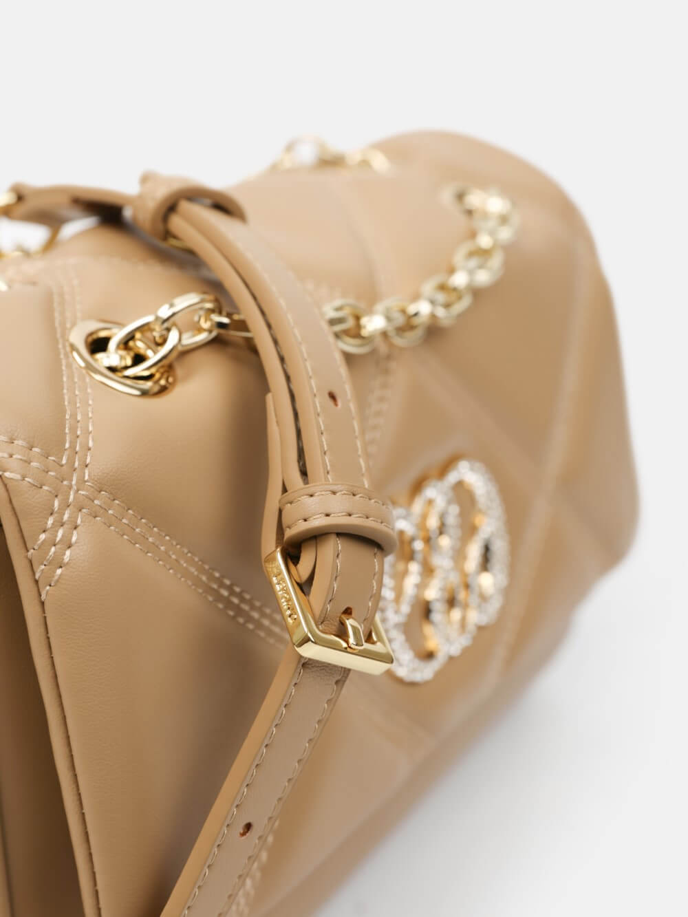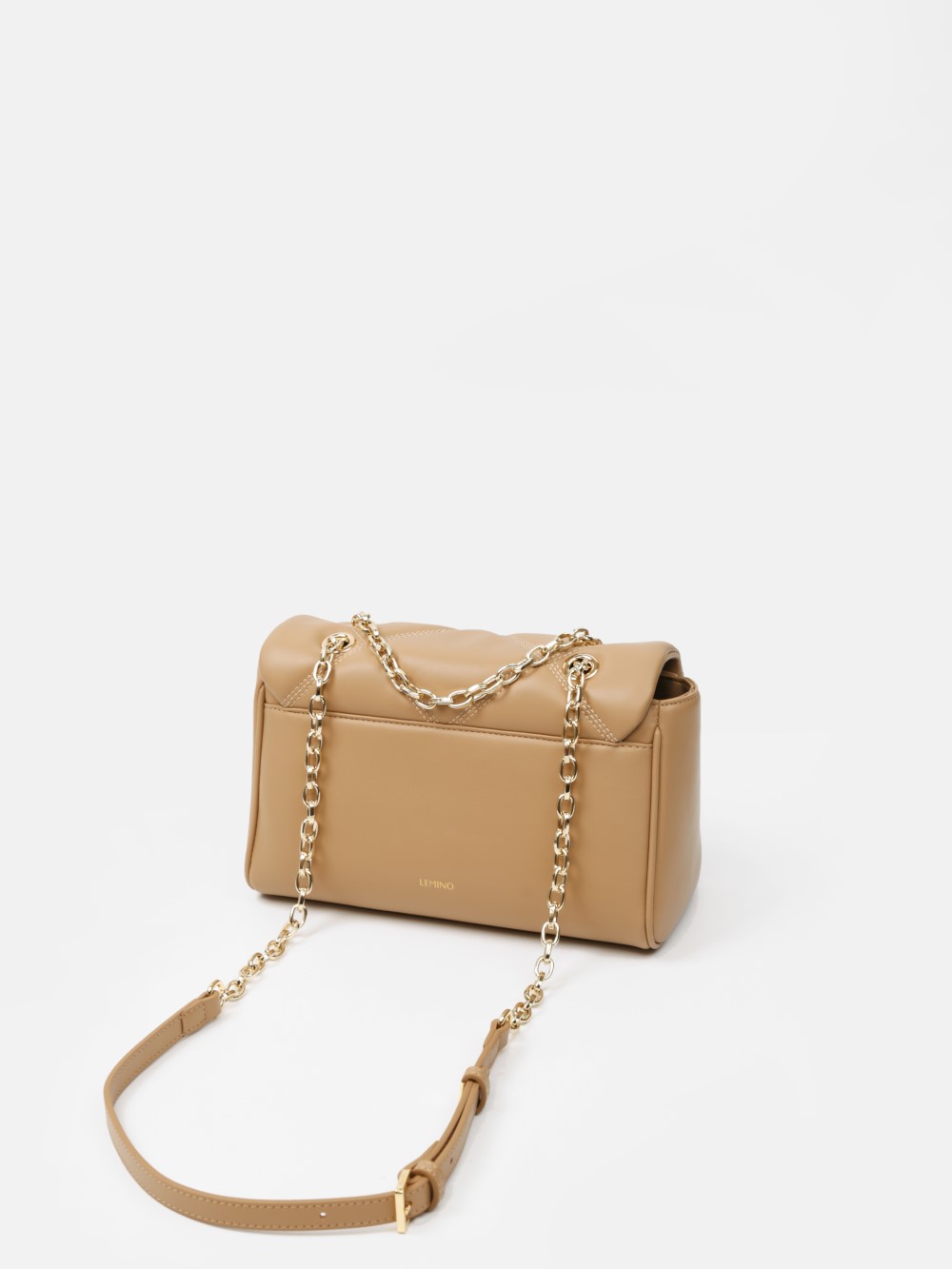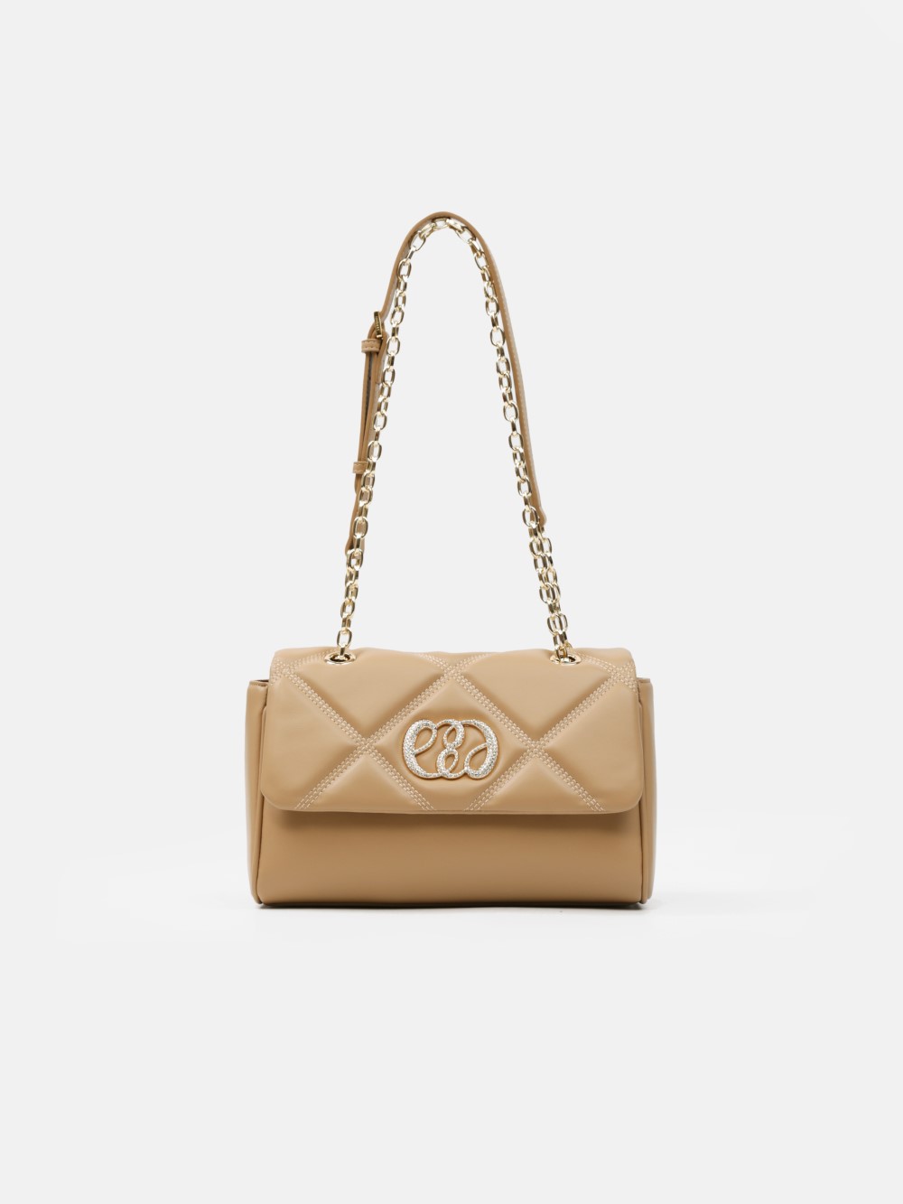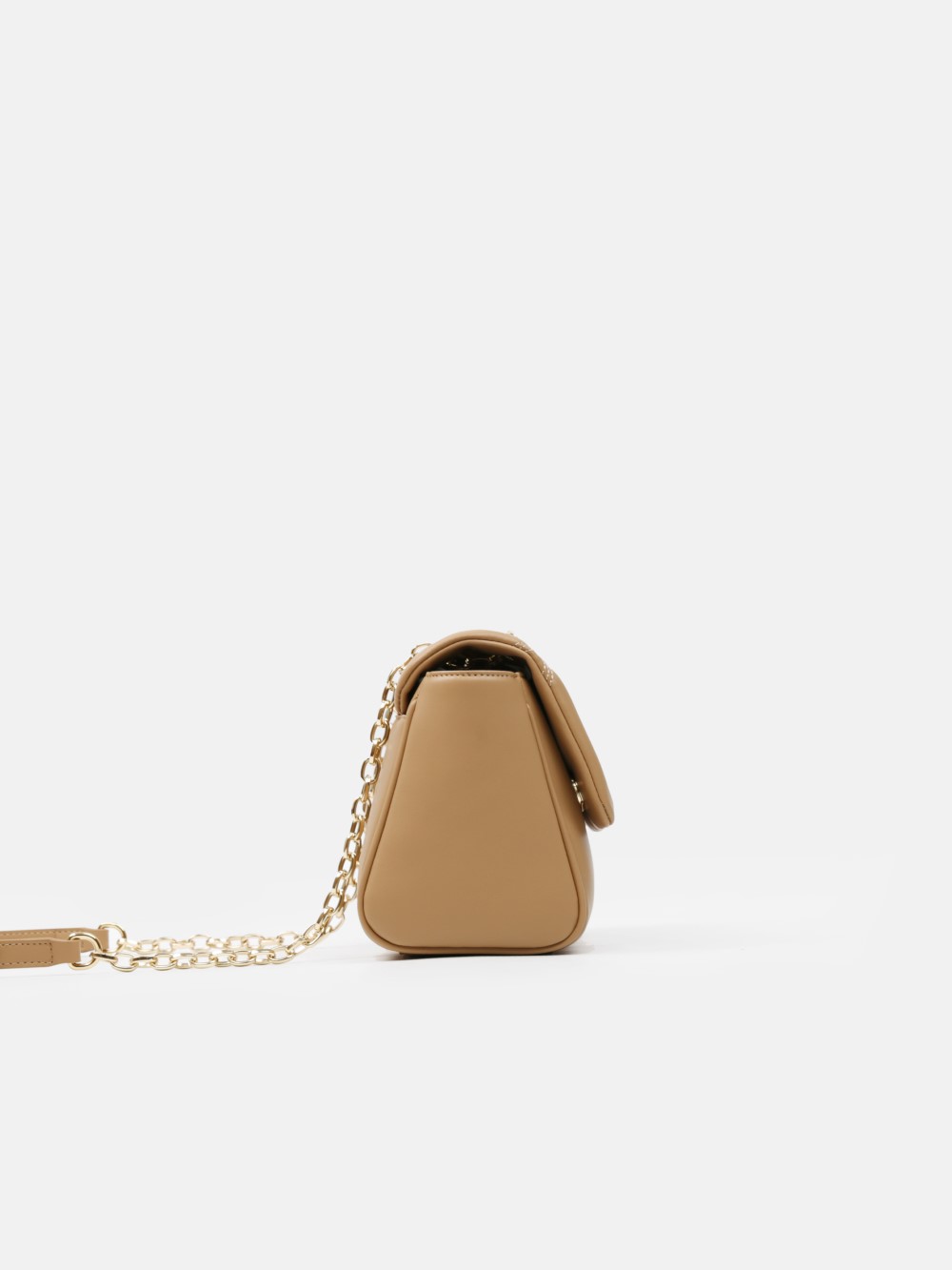 Dáng chữ nhật, nắp gập thanh lịch, điểm nhấn logo kim loại sang. Dây đeo xích kết hợp dây da điều chỉnh, linh hoạt đeo vai hoặc đeo chéo.