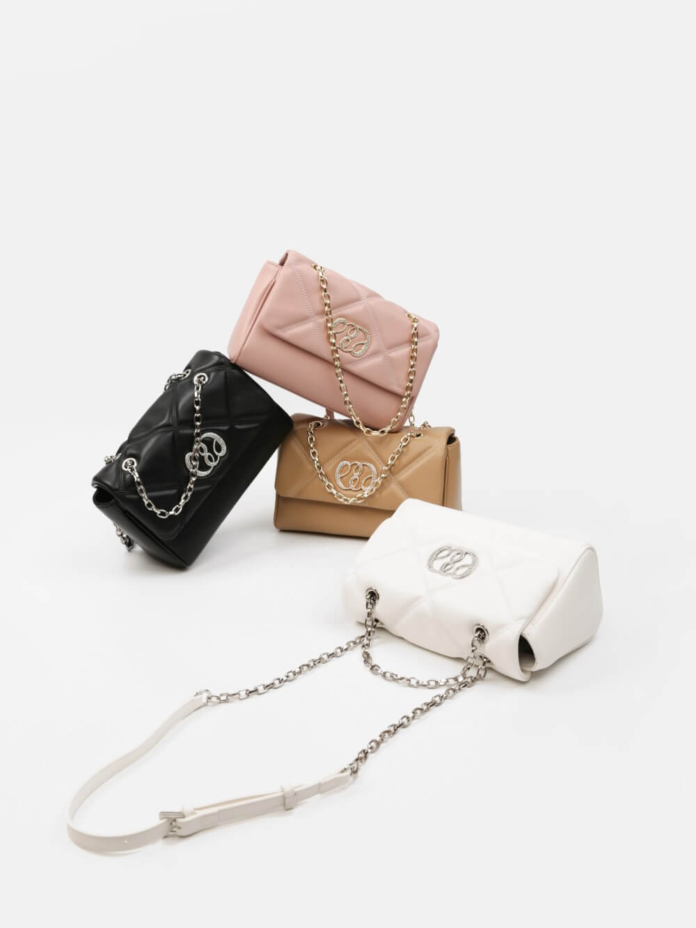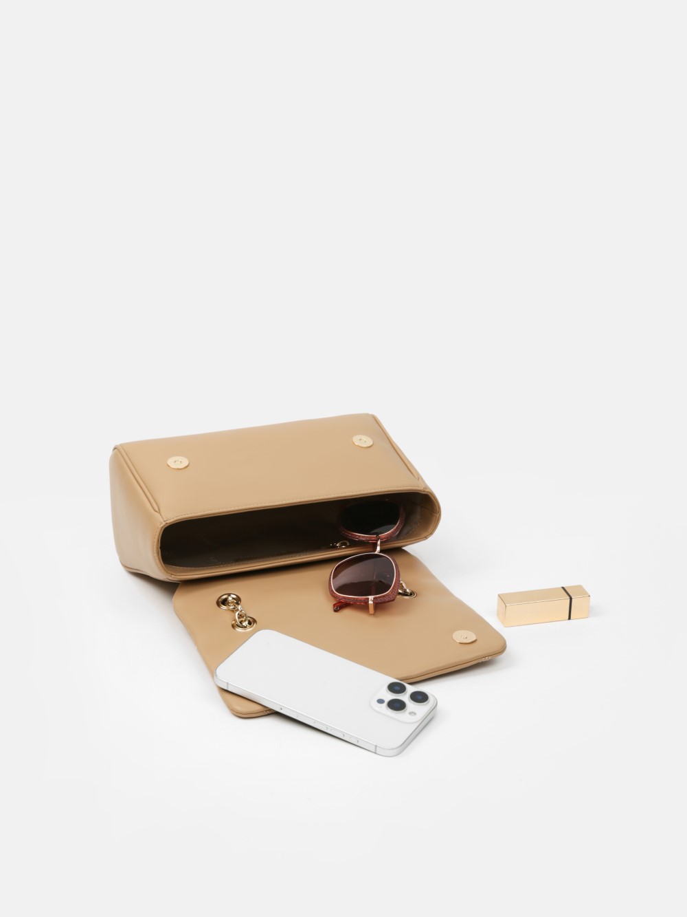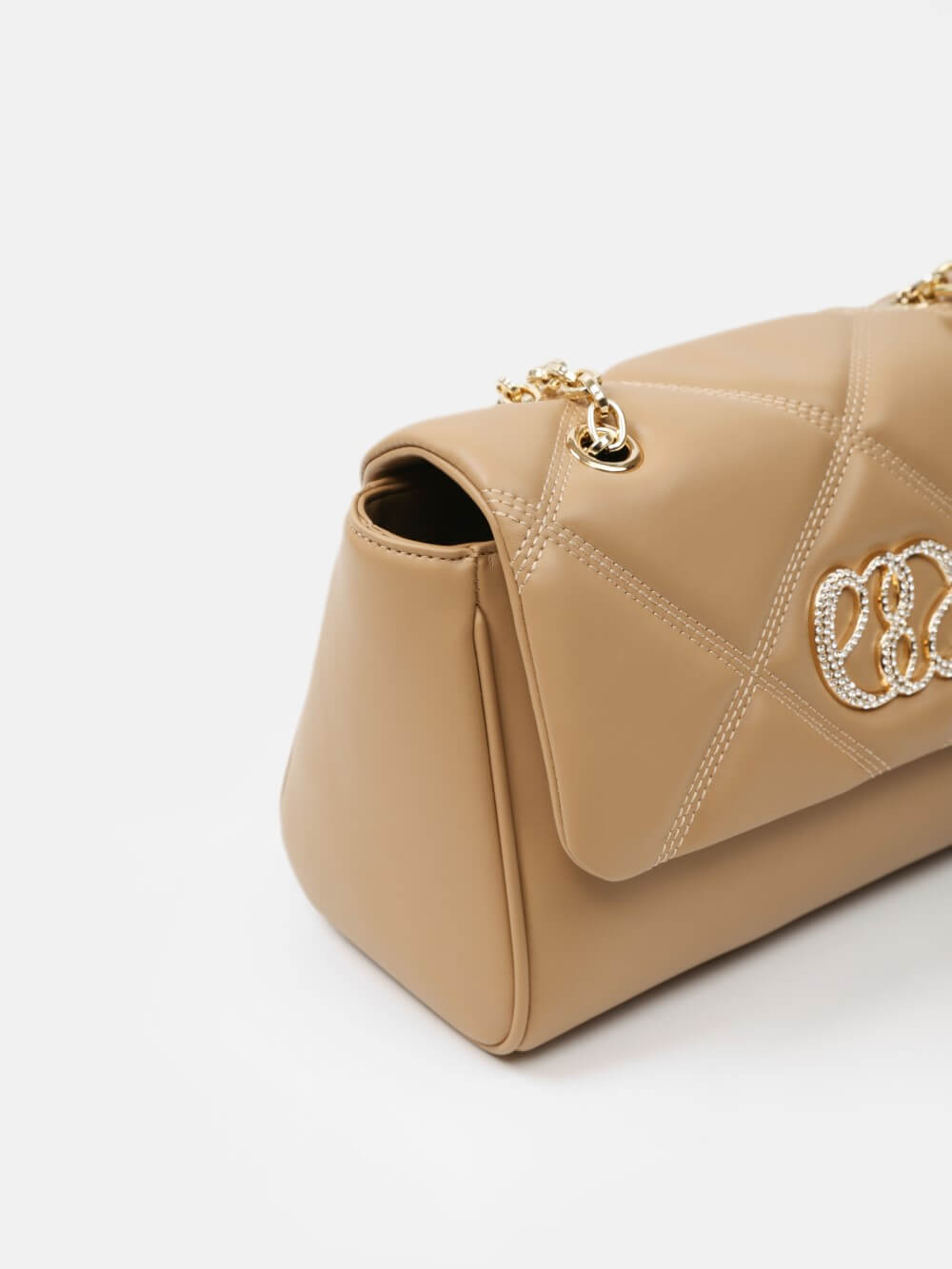 Dáng chữ nhật, nắp gập thanh lịch, điểm nhấn logo kim loại sang. Dây đeo xích kết hợp dây da điều chỉnh, linh hoạt đeo vai hoặc đeo chéo.