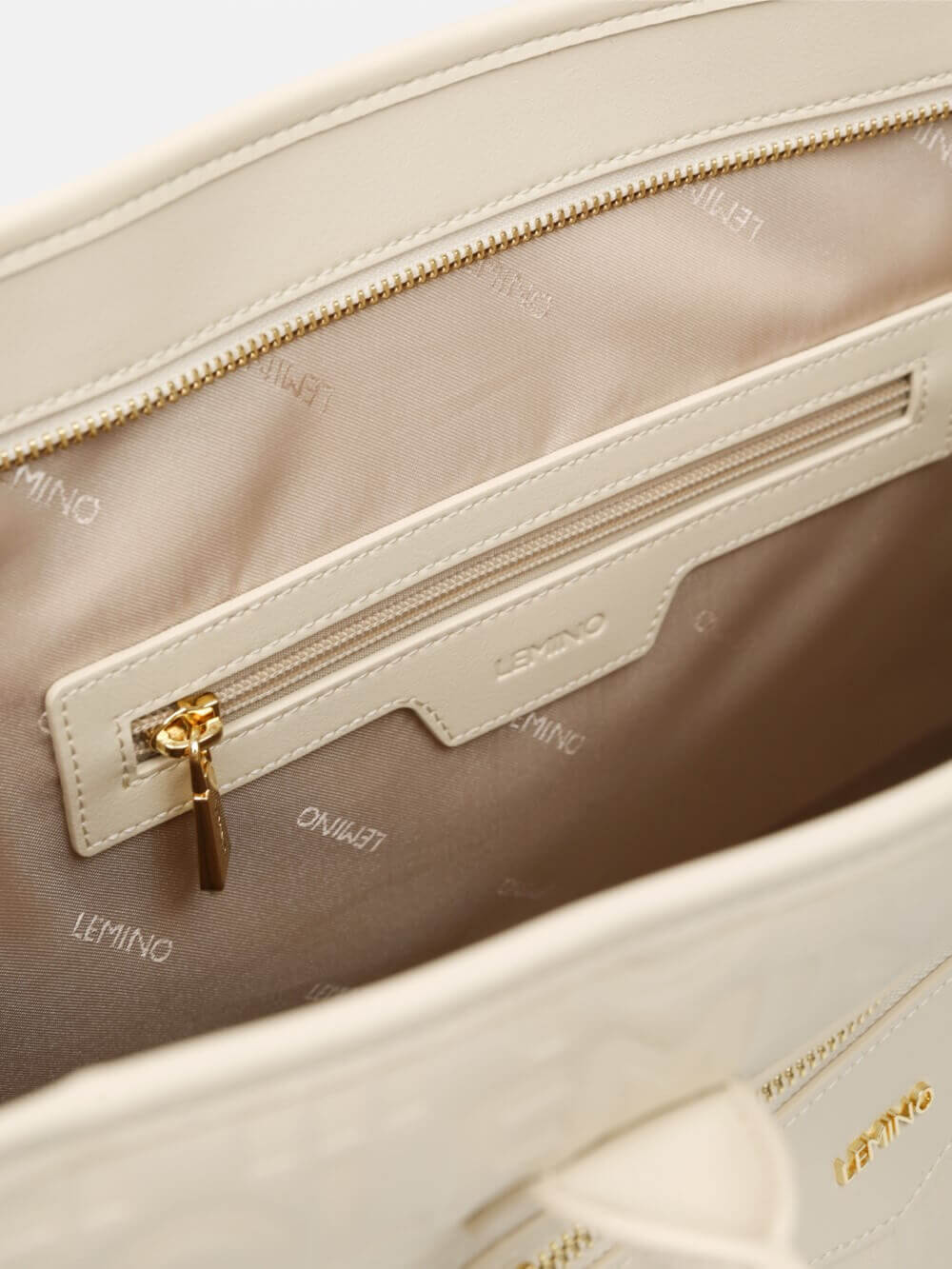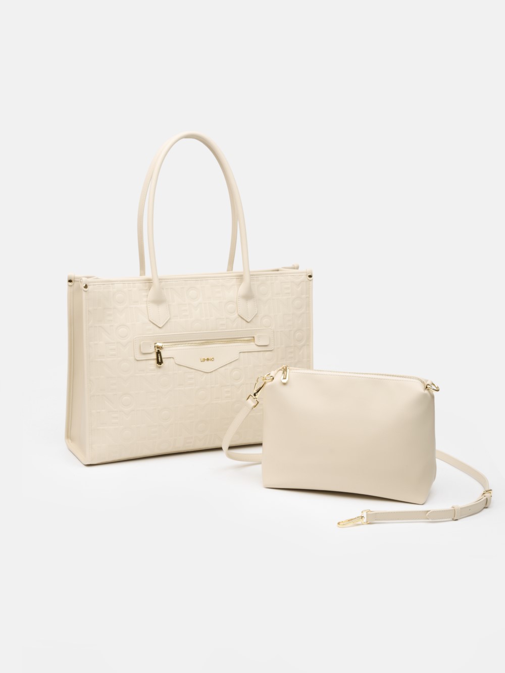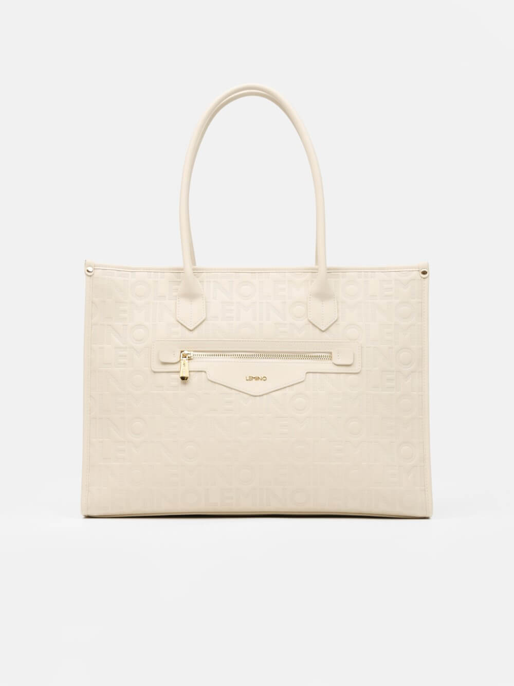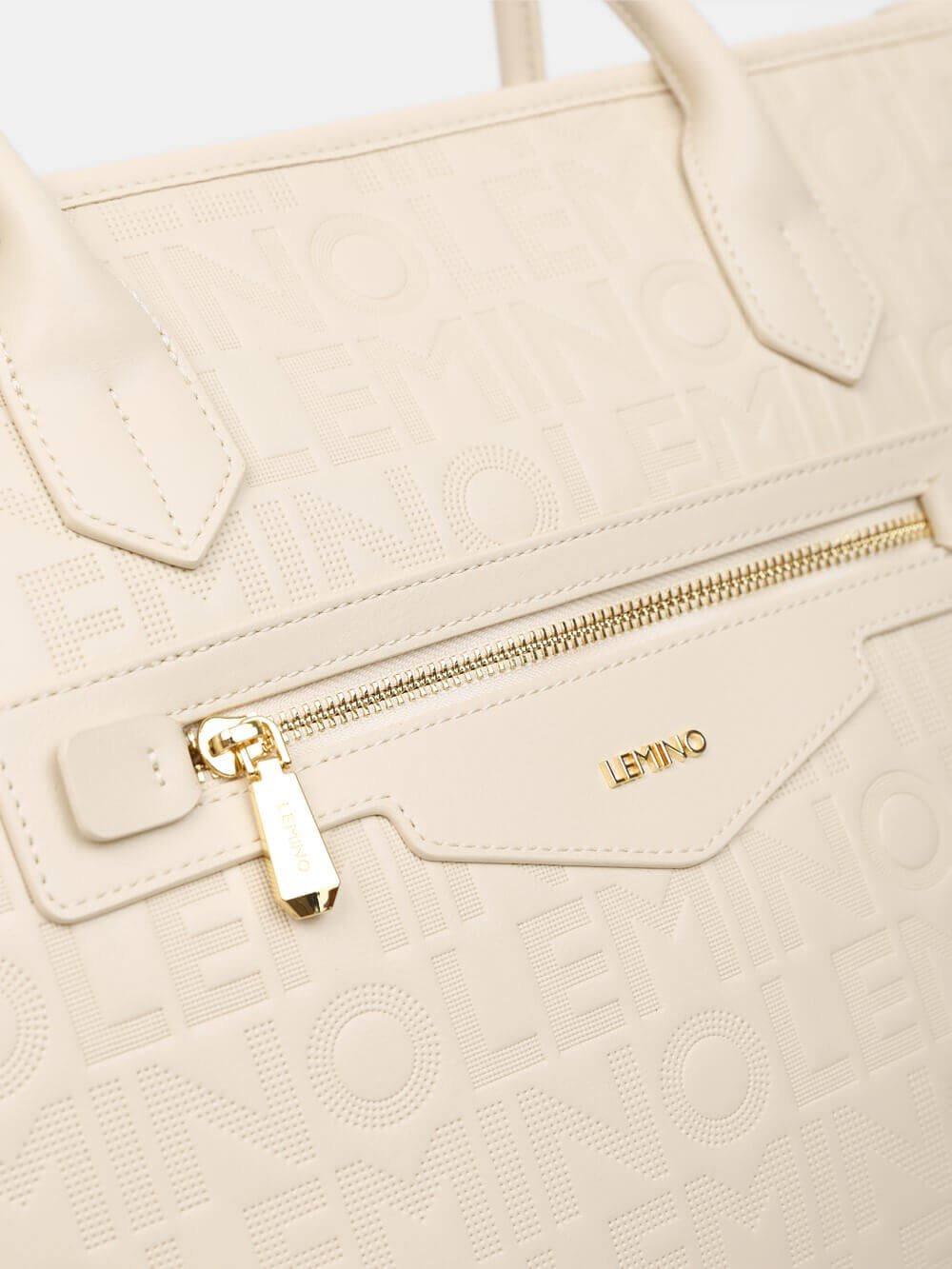 Bề mặt túi được xử lý dập monogram LEMINO toàn thân, tạo hiệu ứng sang trọng và nhận diện thương hiệu rõ nét. Điểm nhấn phía trước là ngăn khóa kéo ngang kết hợp logo kim loại tinh tế, vừa tăng tính thẩm mỹ vừa thuận tiện để cất giữ các vật dụng nhỏ.